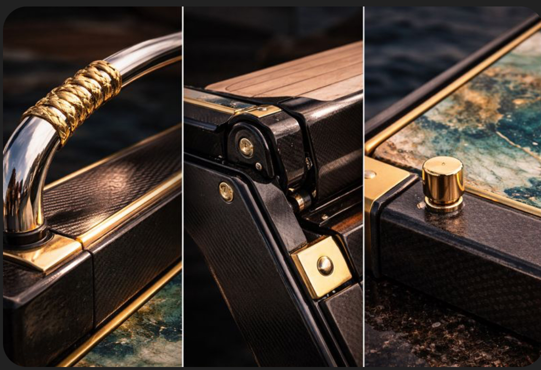 An immersive environment inspired by the stern of a luxury yacht, where noble materials—carbon fiber, teak, and gold finishes—combine with clean, essential forms to express a bold, elegant, and contemporary style.