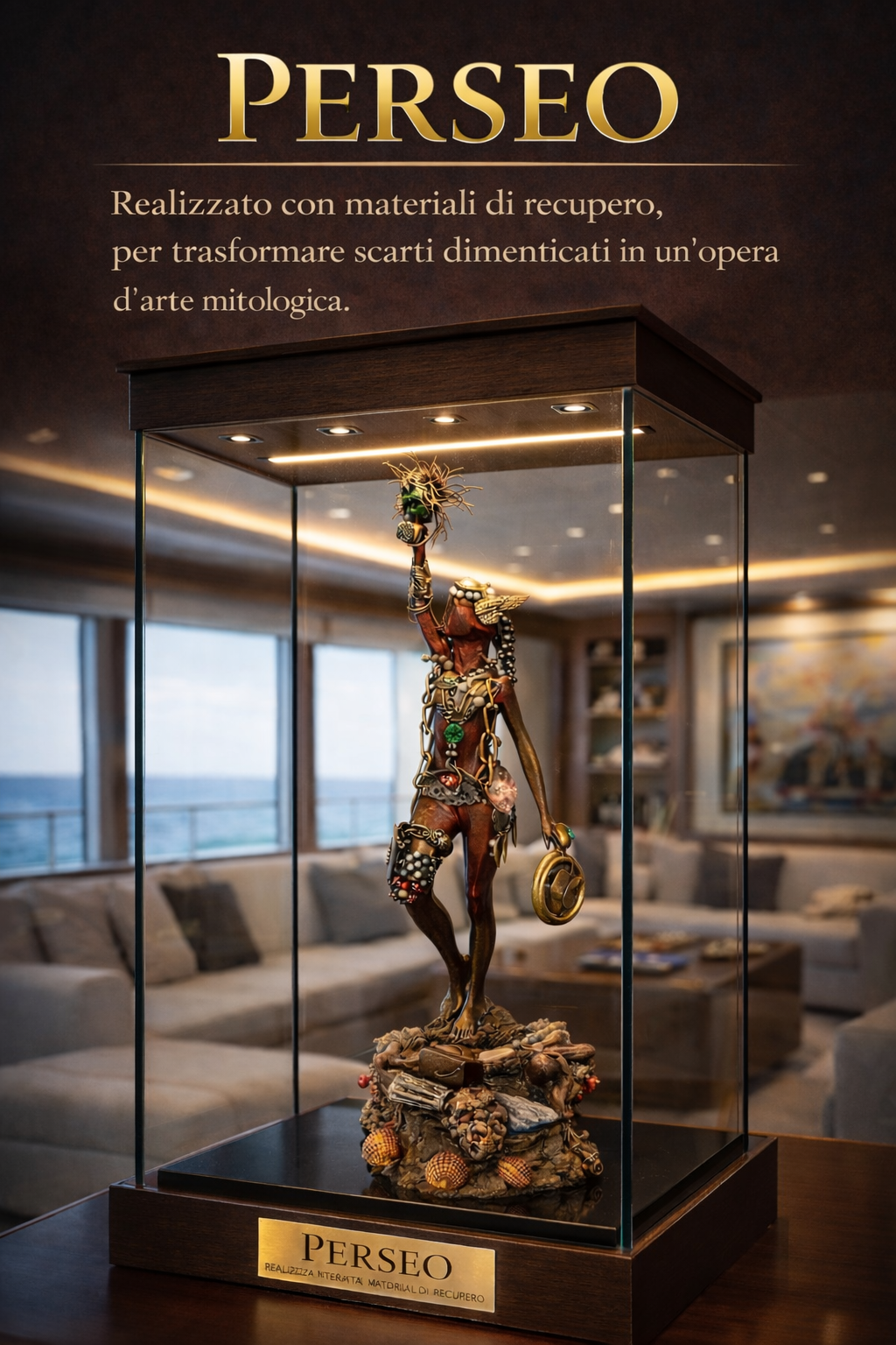 Perseus is a sculptural work created entirely by hand in Tuscany, using exclusively recycled materials. Metals, fragments, and forgotten objects are stripped of their original function and recomposed into a contemporary mythological figure, where discarded matter becomes an expressive language.